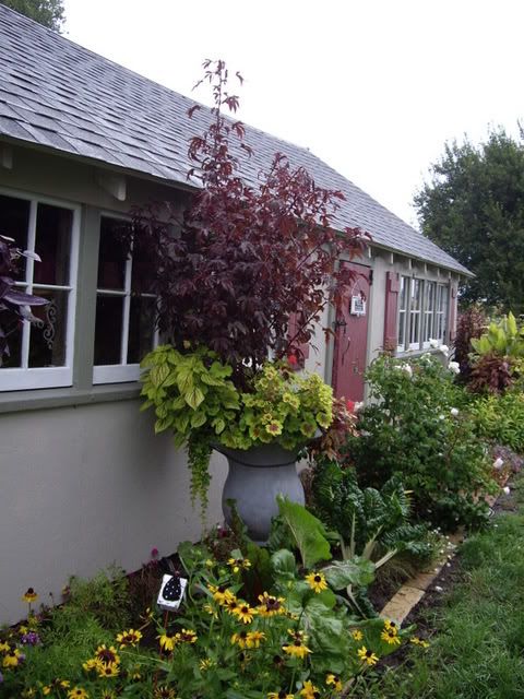 | Nope! Not silver lace vine. It's Fallopia japonica variegata and doesn't even seed for me, and no runners in the 6 or 7 years I've had it. I like the generic so much that I got a named variety, 'Freckles' I think, from Plant Delights a few years ago, and that one is really slow growing. Deanne, the photos of Sue's and Moniques are stunning. So glad you took and shared the photos with us. But no group photos of all of the idylls with wine glasses??? Michelle your containers match your shed! Just beautiful! And I like the combine in the background. Really, you shouldn't spare us the farm equipment. Those of us far away from that part of the country love to see it all. What is the difference between straight hibiscus acetosella and 'maple sugar'? I see the photos of maple sugar and no obvious difference to me. Denise, your containter is stunning. I thought the ghostly images on the fence quite artsy actually. GB, love the photos of your gardens and the little one with Indy giving him kisses. Yes, I have Vitex Agnus Caste. It blooms in late June or early July here. I'm actually surprised it's hardy for you, as I never saw it when I lived in New England. So I took it as a southern plant. Is yours a different type of Vitex? Not really familiar with it, just grow a couple and enjoy them. I don't usually cut them back, but thinking of experimenting next spring to see if I can increase the branching and blooming. I know I've missed a lot, it's hard to catch up on a week of idylling all at once. So wavining hi to all, and reluctantly going to do some housework... Cynthia