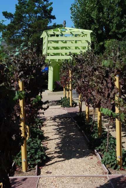 A lime green garden folly with fall colored grapevines