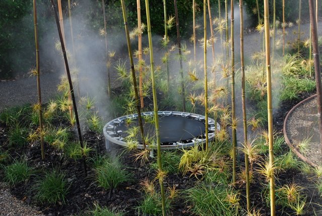 What you are seeing here are little tillandsias wired to bamboo stakes with misters creating a fine fog. Very cool looking.
