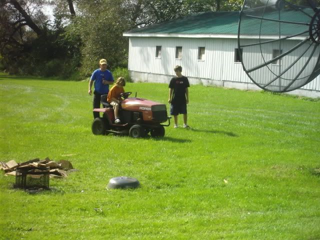 Glenn teaching Shane how to drive the tractor, while his new buddy looks on: