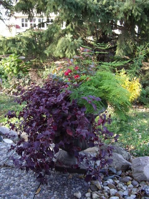 | Hi all, I was really dragging today for some reason and finally figured out that I’d forgotten to take my thyroid medicine yesterday. Whoops! Anyway, I’ve been taking cuttings like crazy the last few days and I think I’ve finally gotten all the coleus cuttings I want to keep for this year. I’ve not started cutting the fuchsias back yet as I can’t stand to cut off all those flowers! Soon though, I’m going to have to bite the bullet and just do it. I’m also working on a plan for an ornamental gate for the top of the hill to screen the compost bins. Doug will build it for me and I want to incorporate a painting of the garden in the gate frame. I’m actually looking forward to designing the painting for the gate. I think it’s going to be neat when finished. ~~ I moved the new planter to a spot in the border next to the pond and it looks quite pretty there. Kathy, I’m so glad you can appreciate my restraint with only bringing home one container from NE Garden Ornaments. LOL Seriously, I was practically drooling over the stuff there. ~~ Jeesh, I can't imagine wanting to get rid of an old avocado fridge. LOL Denise, funny but Doug said the exact same thing about the garden ornament place, that it looked like a cemetery. ~~ So how cool, you are from French Canadian stock from Holyoke, MA? Bug, what a great idea to play Scrabble without keeping score. Just a word game. I like it! ~~ I’d love to join a book club because I have a very difficult time forcing myself to read anything that isn’t entertaining in some way. Sue, love that salvia! I hadn’t remembered that is where you bought your fountain. Did they deliver it and set it up too? Do you know the manufacturer? Michelle, Great news that the washer got fixed! That’s a plus. ~~ Yes that is a mirror in the pic with the hanging basket. Thanks! ~~ Looking forward to getting that recipe for the oatmeal bars. ~~ Love the photographs, especially the one with the fern. Is that I. Purple Lady in there with it? Chelone, thanks for checking in. I was getting concerned for you. Marian, love that asparagus fern. OK time to try to get a few more things accomplished this afternoon. It’s a perfect day to work outside. Deanne