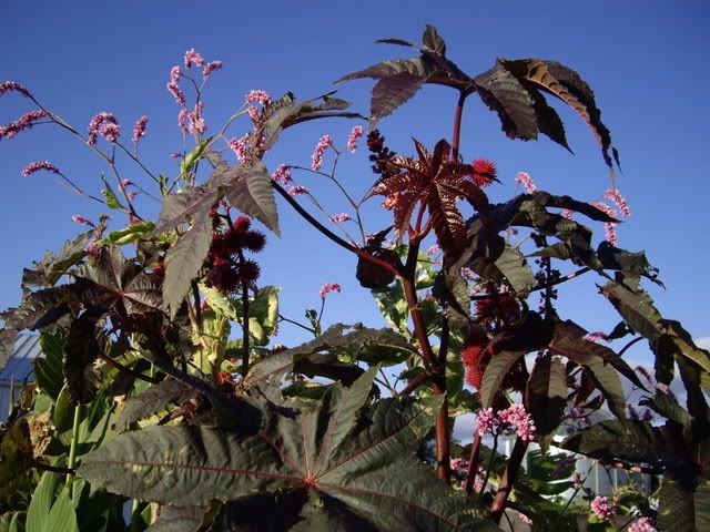 | A few shots from my garden today. There is just so much going on yet. We are getting down in the 30's at night this week, but not too low yet. On the left the aster 'Lady in Black' which is a first year plant has gotten huge and is blooming nicely. Deanne, this is a fern that I over winter. It is so dainty. This picture shows what a beautiful day it was. Castor bean and variegated KMOGG: I have a spa pedicure scheduled for the morning and then Kenzie is coming tomorrow to go to the apple orchard/pumpkin patch. It sounds like fun! Michelle |