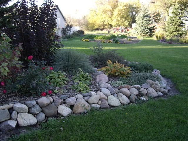 | Kenzie is due to arrive any minute and she wants to go for a combine ride with papa. It is now dark before 7. It was an absolutely fabulous fall day. Sunny and mild, but not warm enough that all the bugs came out. I did manage some gardening amounst running errands for Rick. I dug up one King Humbert and one Wyoming canna and they yeilded enough roots for next year. The rest can decompose in the ground. I also dug a yellow striped one that I can't remember and some elephant ears. They all got rinsed good with the hose. I'm still trying to decide what to do with the musa basjoo. I have only 4 or 5 containers left and all but one are in the garage or shed. The veggie garden is all cleaned out except the parsley and carrots. Its supposed to drop to 25 tonight. So I took a few pictures today. Deanne, the crew just gets sandwiches, chips and that kind of thing. I did make it to the orchard this a.m. so apples were also part of it. Denise you have some of the coolest looking plants. When I saw the stand you are using, it reminded me of something you would find on a farm. I have incorporated several "found" items in my garden. The other day I found buried in the ground a gear that's about 8" across so I had to find a spot for it. Chelone, your mum sounds like she was a very smart lady. I'm glad you have such nice memories. I must sign off |