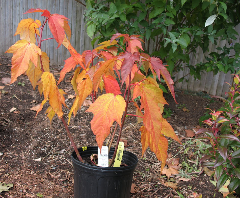 | I'm heading out the door in ten minutes, but managed to get a photo of the 'Kopper King' Hibiscus I dragged home 50% off from Russell's on Sunday. I thought you all might enjoy seeing how vibrant the fall color is before the leaves fall off. |