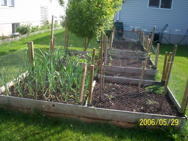 | So here are the opriginal raised beds here at this house. Where the little shrub is, there is now a narrow bed with a large trellis. I have four clematis' on the trellis and herbs at their base.