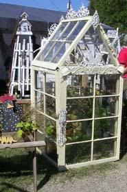 | A picture of the conservatory as requested. We had 16 windows to work with and used them all. Just to give you an idea it's approx. 4'x6' and just over 8' tall. The front doors both open so it's easy to walk inside. It's hard to see but the handle in an old glass doorknob. It doesn't have it's finishing touches yet...I have ideas for embellishments in the spring like a little chandelier hanging inside and twinkle lights and some 'gingerbread'. I want it to become sort of a fairy house. Also the plastic on the ends is just for winter so I can protect some plants inside. This will give you an idea though...
