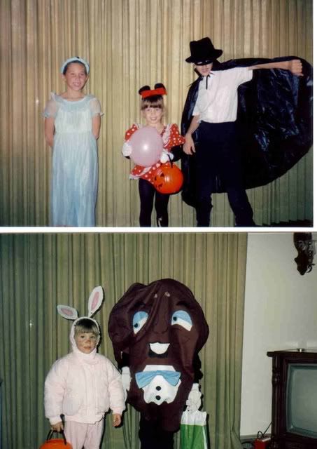 | No shots from the family archives, I'm afraid. Only rule in our home was that you had to be something scarey for Halloween. LOL at the red "six pack" sported by Three Carrot Sticks. Cracked me right up. All the shots are great. What a fun thing Halloween is. :) |