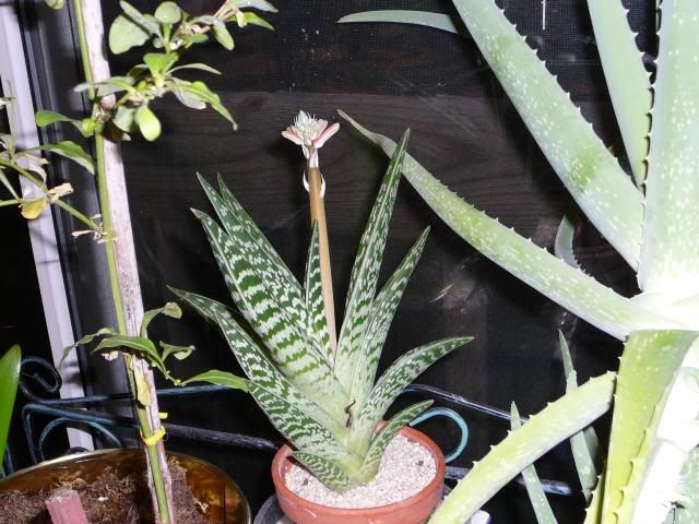 | A quiet Sunday evening here on the prairie. We had five inches of snow on Friday, so the three deer that visited us in the back field today were easy to spot. Like Cindy, I took all of last week off and don't go back to work until Wednesday. What a luxury of time it has been, with not much of an agenda outside of the family gatherings. Yesterday, in a total indulgence, DH, DD & I watched all 5 Harry Potter movies back to back. We started at 9:00 am and finished shortly after 10:00 pm, with minimal breaks to make (real) popcorn and frozen pizzas. Tomorrow I will order our new loveseat. We decided on a chocolate brown leather that has a nice woodsy look with our dark green sofa. Now I need a new area rug... I've spent too much time on this computer ordering things over the last few days! Must get back to work and earn money! Cynthia, count me as another who googled piecathis! I believe that the piecathis is easily propagated from cuttings. Norma, your pond ice looked like shattered glass to me. I've never seen ice quite like that before. Eden, Jen's fiance looks like a big guy next to Miss Bella! I've never seen blooming aloes before - cool! I have a lab crawling into my lap, so I'm going to post before this is lost! V. |