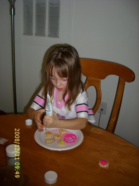 | Heat wave today, it was 7 above this a.m. and they are actually talking 20’s or possibly low 30’s, but then back to the deep freeze for tomorrow and then warmer again for Christmas. Crazy! I’m pleased to report that my back is feeling better each day. Last night instead of swimming I just spent my time in the hot tub. Chelone, DH’s sister and BIL go to southern Florida each year around mid-November to Christmas to sell Christmas trees. No gloves needed there. Great Christmas card shots of your house. Even though it didn’t get above 10 yesterday it was warm enough to melt some snow on the roof at work and produce a leak on my desk. Well, the tickets have been purchased and we leave for FL on January 3. Mary, Annie’s gesture was very touching – regifting at its best. You must be very proud of her. Saucy, I absolutely love the tuffa containers and the way you have them planted. The moss is wonderful. Julie, sorry to hear about the accident, especially glad to hear that no one was hurt. I really like your fireplace. Cynthia, those greyhounds are so lucky to have you to spend their golden years with. Hopefully, Monte can enjoy life comfortably for a long time yet. Jerri, good to hear that you are feeling better today. I’ll leave you with a little cookie decorating pic.