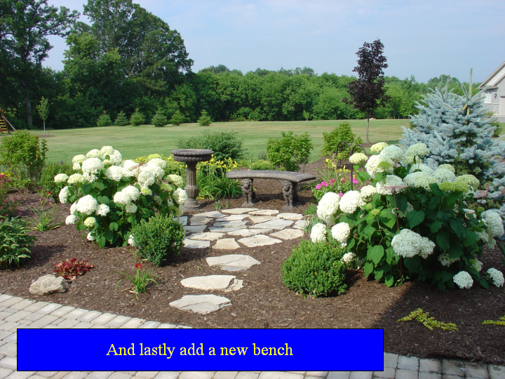 | wow, what inpiration. We moved into our new house on 2 acres with little to no landscaping. Needless to say we have lots to do so I love this thread for ideas! I have been keeping a powerpoint show going on my computer of nice ideas and I got tons from here! Here are a couple of my favourite spots I managed to accomplish over the last two years: My bird sanctuary created this summer (only the hydrangea and blue spruce were there before):