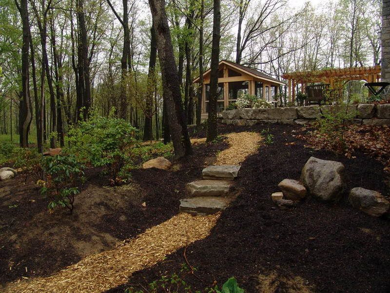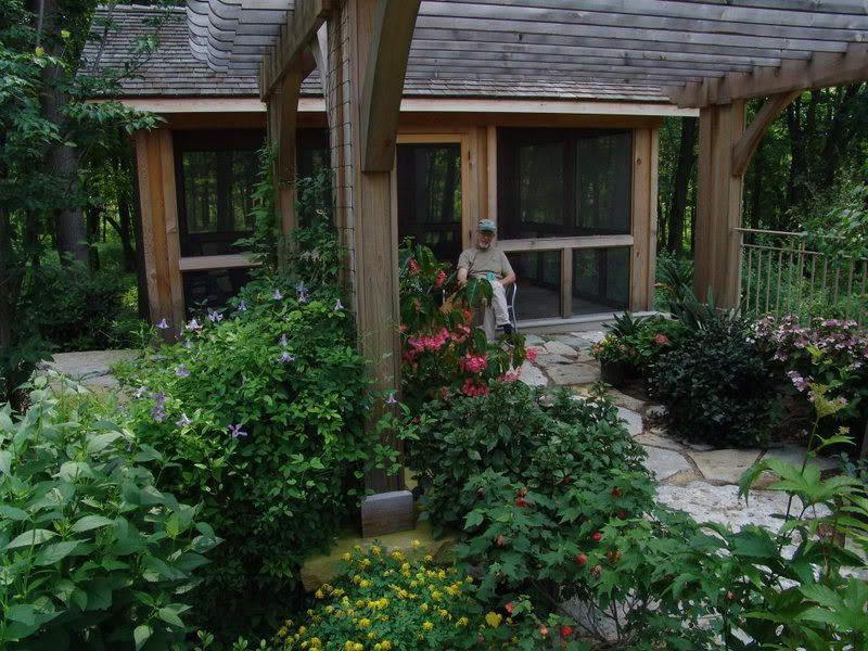 | Hi Denise! Actually, we built this whole house and all the hardscaping, retaining walls, pergola, screen house (though I like your designation of the screened in garden room...). There was nothing here except the beautiful site before we started -- no structures of any kind, that is. The screen house is in fact Jim's and my favorite room in the whole house (not even in the house...). It is perched on an elevation so it feels like a tree house, and gives one a view out into the rolling woods on one side, the woodland garden on the other, the terrace and its beds on the other -- great place to relax on a summer evening. And you are absolutely right, this is a BIG project. That is what worries me the most, because it is really way more than one or two people can manage. But I am trying, and keeping my head above water, sort of. I haven't even shown you any of the front part of the garden, the big sunney front beds, the entry area, a small meditation garden. The trick for me is going to be to plant in such a way as to lower the overall maintenance of the garden. I have had some help weeding but not that much. It remains yet to be seen whether this can be done in such a way that it is manageable. But for now, I'm trying, and more or less having fun. |