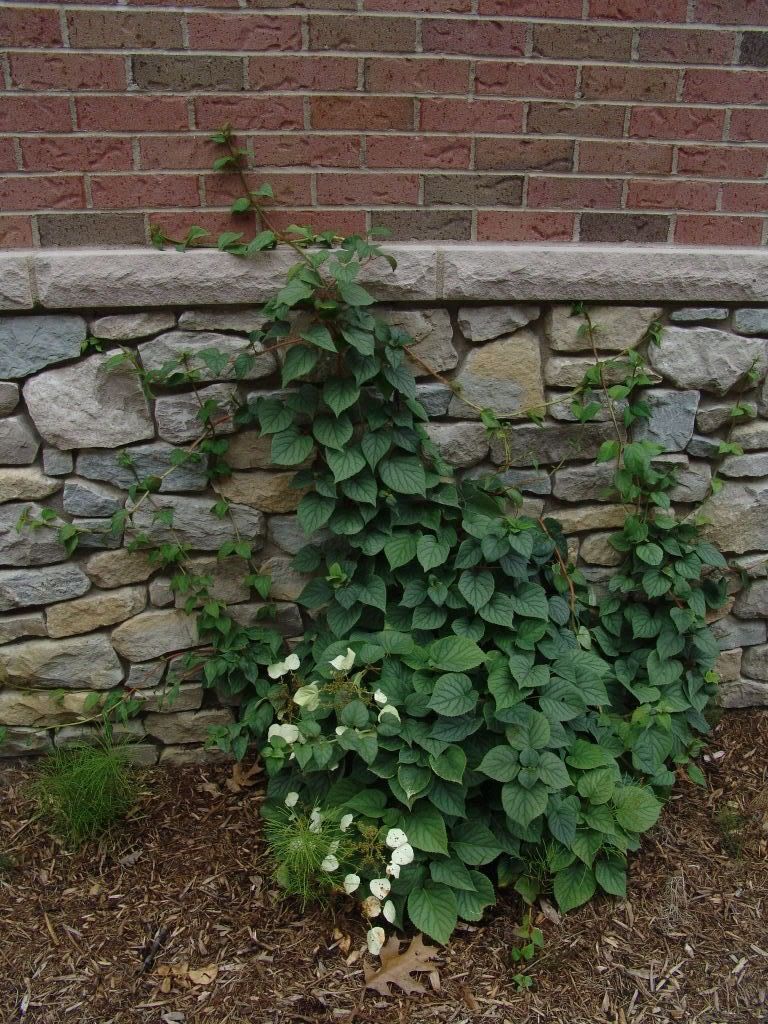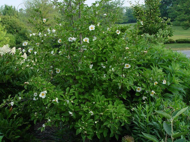 | I have found a few more pictures of new parts of the garden that might be of interest. The garden is much bigger than even some of these pictures suggest, because all I have shown so far are the back parts of the garden and the woodland. There are large beds in the front that I have only begun to work on this fall, and I forgot that I had even taken any pictures. The front entry has a little secluded area off to one side that we are making into a meditation garden. It will have relatively simple(r) plantings (I have a hard time making ANY planting simple), and because it is a very protected niche surrounded by the house on 3 sides, it will be a place to try to grow some tender things. It is 'guarded' by a sentinel paperbark maple that I moved from my garden: We are having great fun starting vines growing up the masonry/stone walls, for any gardener of course, one of the main reasons to have stone or brick walls at all. This is Schizophragma hydrangeoides 'Moonlight', after less than one year in the ground. It has put out a tremendous amount of growth, being near a sprinkler head I think. I chose a wonderful specimen of Stewartia koreana from my old garden to act as the major specimen tree for the front entry beds. This plant has been a much better bloomer when young than S. pseudocamellia for me, and it has outstanding 4 season interest. This particular plant has been a very abundant bloomer, producing many 100s of flowers throughout July. I somewhere in my computer lost the pics of it in bloom this year, but here it is from my old garden in early July: