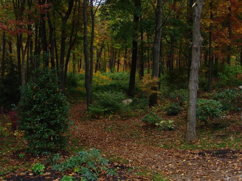 Right now the woodland garden is limited to the slope right below the house on the east side. In the other thread where I posted aome pictures you can see the extent of it -- this shows where the woodland garden is so far. It lies between the main woodland path below and the house. So far I have mainly plantes shrubs, but I started moving some of my collections of epimediums and hellebores into this area. I am really looking forward to working on it in the spring.