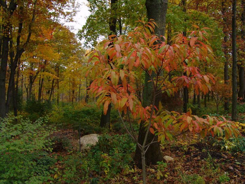 Fall in the woodland garden is also going to be important as I have selected deciduous trees and shrubs partly for fall interest. View of the woodland from the entry path, showing hollies and deciduous trees in fall dress Oxydendrum arboreum, Sourwood, also a tree I moved, and one of my very favorites A variegated Brugmansia on the terrace, in fall