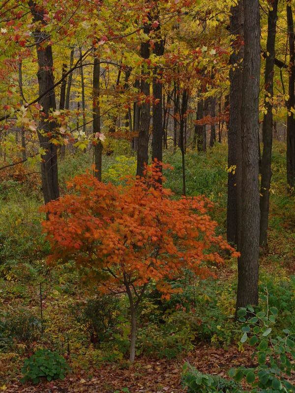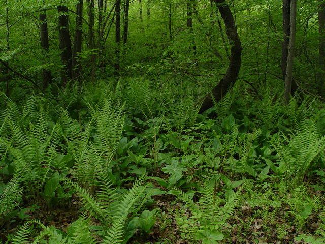 The woods that are there on this site are relatively pristine. It has wonderful native plants, a dozen species of native ferns, spicebush, musclewood, maple-leaved viburnum, very few invasive shrubs -- virtually no garlic mustard or buckthorn for example. So my task in most of the woods will be to enhance the native flora and keep out the invasives. I don't have two many pics of the woods on line, but here are some views of the swamp and stream area, in spring, with carpets of new york fern and larger clumps of cinnamon fern. All three osmundas grow on this site.... and fall, when the golden yellow color of spicebush lights up the swampy woods.
