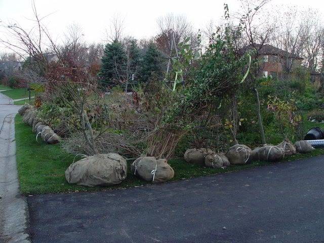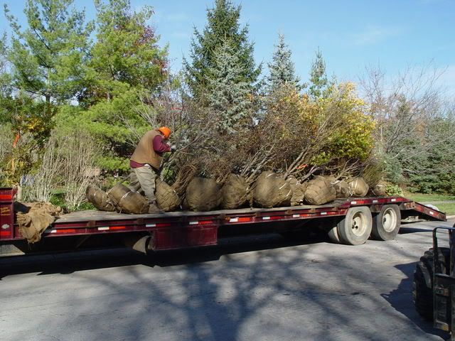 And for people who comment on maturity, yes, it does look mature in areas (mostly those I have chosen to show you...). This is partly from the site and having an old gorwth woods as a backdrop. It is also from having moved 100s of plants from the old garden. Remember that discussion? About the pros and cons of doing it? Well, there are clearly some 'pros' to moving plants, one of which is that you end up with larger more mature plants in your new garden. Is it worth it? I think my answer probably changed from "no" right after we moved in, to "yes" . Here is just a taste of what moving plants from the old place was like -- trees and shrubs which were moved with the help of a local crew: