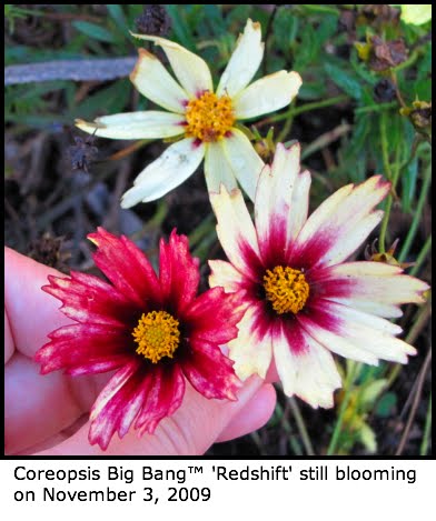 | I snapped this photo of the Redshift yesterday so my blog readers could see all the colors on one plant. I had to pick two of these blooms to hold up beside another so that they could be in the same photo. We've already had several light frosts and the coreopsis are still blooming. Cameron |
