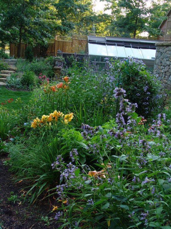 | Thanks everybody. Well Nancy I don't have too many pictures of the house as such, and it is a little difficult to photograph as a whole because it is big and has a 'footprint' which is pretty spread out. It IS a beautiful house, if I do say so myself, and I think really well integrated with the site and the landscape. The house is built along the edge between the sunny open areas of the garden and the woods. One of the best, maybe the best feature of the house is the terrace on the back of the house which has a big outdoor stone fireplace, a screenhouse and a pergola.