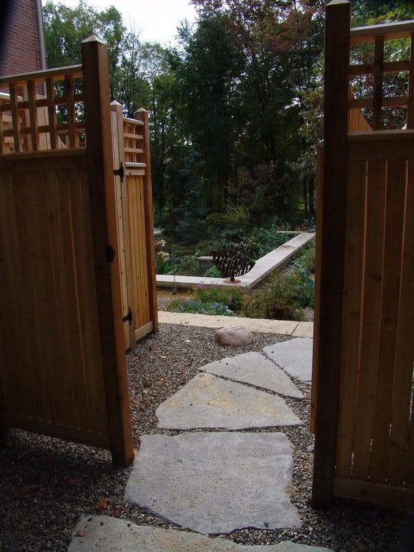 New entry to the back gardens. A new Fence and gate here separate the work area from the garden and give a sense of entry to the garden. This area goes into a gravel garden, and down below, what we call a "tea garden" (no, I don't drink tea but AM coffee and PM wine are great here). The tea garden is a hummingbird heaven. Yes we have problem here with iron in water, the rust is from an iron filter runoff which hopefully will be corrected next week