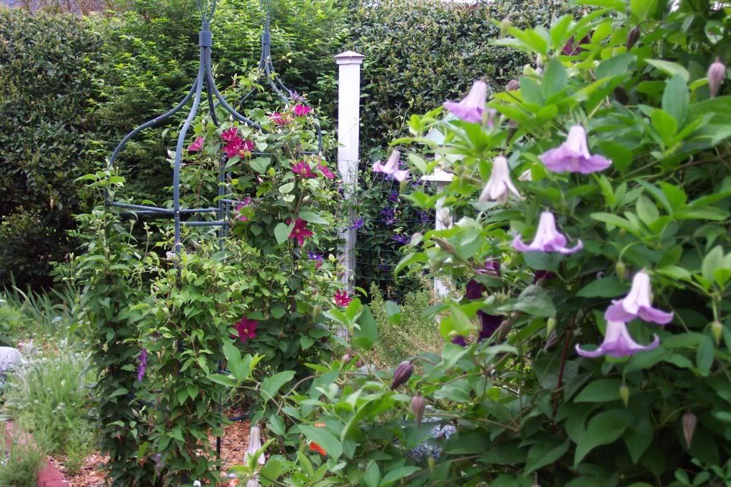 | I'll get you my pretty and your not-so-little lawn too! Carla, Have you heard of BETTY CORNING? It a super healthy lavender-blue clematis blessed with a sweet jasmine like fragrance. Looks lovely with any warm colored rose. Don't believe me? Well then, just take a look at Harry's beautiful Betty with Westernland. TRUST ME my dear, those soft violet nodding bells are so dainty and precious that your neighbors will be positively green with envy. She would also be perfect with pinks and whites, giving your garden a shimmering fairytale like quality. And on warm summer evenings when the sweet fragrances of rose and jasmine waft through your windows... Image of Betty Corning by Harry Betty Corning is on the right. Image by nckvilledudes posted at the Clematis Forum. |