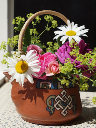 | A very pretty picture of the Common Moss and Mme Isaac Pereire. I love the teapot, too. Masha |