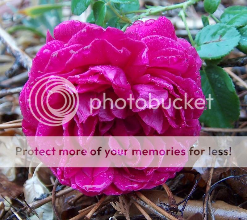 | No rain here; wish we had some! I love Romaggi Plot Bourbon! How big is it in your garden? Not that I have any room, of course. |