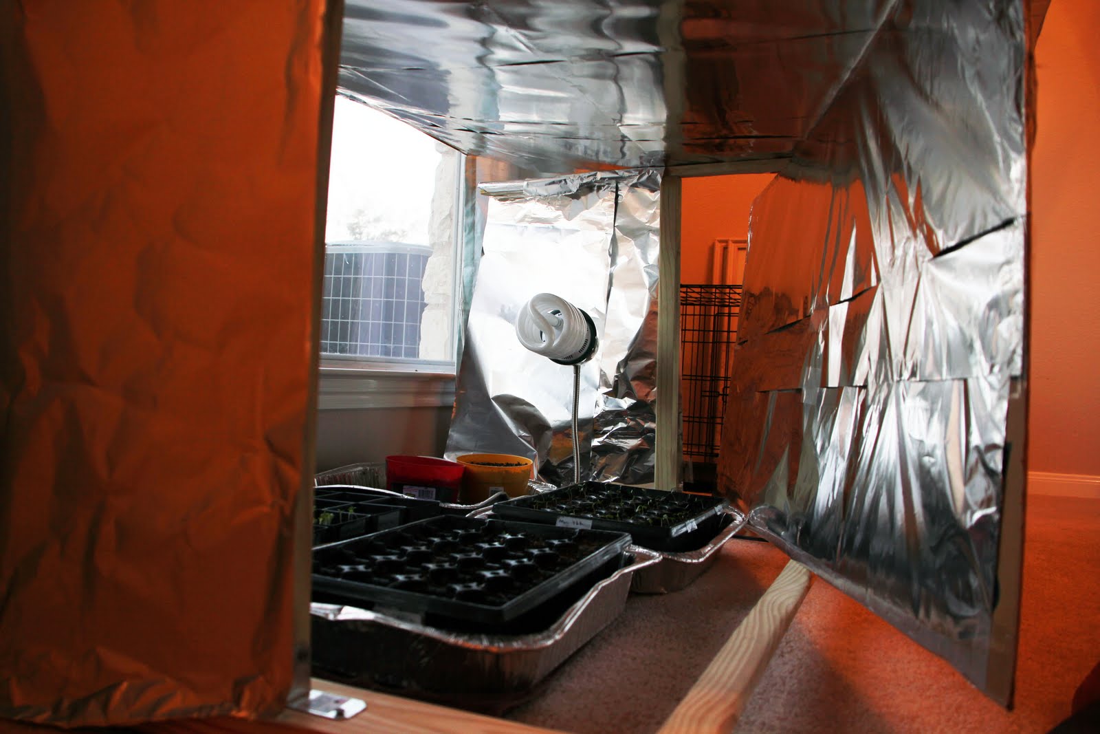 Here is mine from last year, I haven't gotten going yet this season. There was a 5 ft. wide built-in closet with sliding doors in my garage. When I converted the garage into a heated work shop, I pulled off the doors of the closet and put in shelves. I am using cheap shop lights with standard fluorescent bulbs. Each shelf has 2-3, two bulb fixtures. Some are T12, the newer ones are T10, allowing room for 3 lamps. I can put 4-5 trays per shelf if they stick out the end a bit. The tin foil lining was a bad idea, I need to paint the interior white before I start this year.