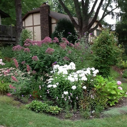 Ornamental grass is beginning to bloom and Sedum 'Autumn Joy''s color is deepening. Most of the hosta big and small are still looking grand.