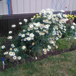Here's what I do with mine, get an appropriate length of rebar and a length of wire suitable to encircle your clump of daisies, twist the middle of the wire around the rebar at the right height. Now put a hook in each end of the wire, gather up the daisies and bend the wire around the clump and hook the ends together. You'll never see the wire. I do this with a lot of my perennial that flop. In fact I've started staking them this way before they flop. With my tall Michaelmas daisies I stake and wire when quite low only the loops around the rebar are loose held in place with a clothespin, this way I can slip the wire up as they grow, no flopping. A cheap and easy fix ;)