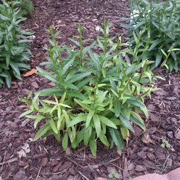 Coral Reef acts the same as Cecily's Raspberry Wine here. Bees still visit the spent flowers after the petals fall, so usually don't deadhead, and doesn't seem to slow down blooming. Consider it optional & the spent heads are still decorative. Finches love the seeds & I love watching their swaying sideways antics, so no seedlings in the several years it's been here. Looks like yours is sending up new buds, Sparky. Remember the variety? Totally agree with LOTS of water even in this muggy climate, to sidestep mildew & stimulate growth & flowering.
