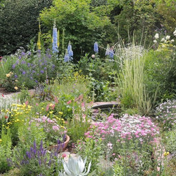 David I know you are focusing on delphiniums and I'm sure those are nice as everyone says, but since I cannot or would even try to grow delphiniums I look at your garden from the standpoint of an artist. Again I say the composition is outstanding along with the balance of color which trumps any one single element. Sorry but I just cannot focus on just the delphiniums except as a nice vertical element. On that note, I love the grasslike element in the middle of the pond, what is that? It gives a wonderfully sophisticated contrast to the rounder flowering plants and is the first thing to catch my eye because its a kind of nice surprise which jumps out in contrast, in a very effective but subtle way.