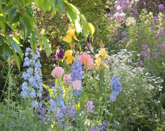 This one shows the 'moat bed' (narrow bed along the top of the ditch) at its showiest at the end of May 2013. Sadly, the brutal winter just past killed off the wisteria flowerbuds so no spring display this year :-( The clematis 'Henryi' that grows into the Chinese wisteria is doing well though - once it blooms we will cut the Chinese wisteria back a bit to remove deadwood and encourage a good secondary summer bloom. We miss the wisteria display!