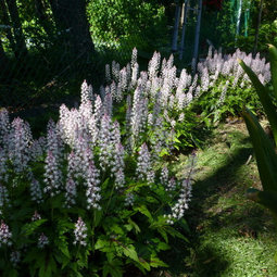 Oh, one of my favorite plants! I started out with two small sections 25 years ago; now there are so many I use them as a fill-in groundcover. Subtly variegated-leafed whitish and purple-flowering plants have joined the collection. And I am trying to get my hands on some B. ochracea, too. Your neighbor's patch looks nice peeking out from under the conifer.