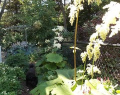 Since this area is on the north side, in the alley betwen our house and the neighbours (the brick wall in the background in the picture above,) there is a fair bit of shade. But the east end is sunny until just after mid day. Moving 10-12' to the left (west) of the clematis area it becomes a shade plant area where the astilboides thrives - its tall flowers reach up into the sun: