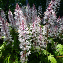 I have Tiarella rosalie cordifolia planted by my pond. Well thats what the labels say but the blooms are white on it. Anyway I also have Arum Italicum bulbs planted underneath and the arum is beautiful in the spring but after the leaves die back I don't have bare soil, the Tiarella starts blooming.
