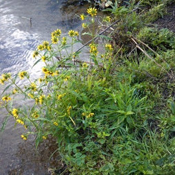 I think the foliage looks wrong for a garden variety sunflower, aka Helianthus annuus). Goin by the small lanceolate foliage I would guess it is some perennial Helianthus (no clue, are there native annual sunflowers over there?...). That it grows at the water's edge is somewhat unusual. Is it a creek or rather pond? Sometimes Jerusalem Artichokes get washed downstream, or rather bits of their rhizomes.