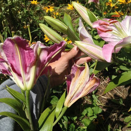 About the lilies: these are some monster lilies; seems they are the ones referred to as 'tree lilies'. Last year almost every plant had 16+ buds. this year they have fewer buds but are taller than last year with most 6-7 ft tall (except the darker pink ones). In other threads people have mentioned recent lily varieties petering out on them, perhaps these are types that lack in long term vigor. I plan to dig a few up later this year and see how the bulbs look.