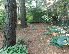 This picture shows the barren area under the larger, surviving pines - picture taken with my back to the dead pine. In early spring 2014 there was snow-melt and rain that flooded most of this area for weeks - the ground was frozen so deep that the water could not drain away. I think that is what killed most of the things that died. And killed seeds too I think - I expected the Sweet Woodruff to return from seeds but it hasn't....