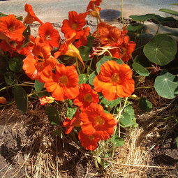 I am green, or orange as the case may be, with envy! So pretty, and I supposedly don't like orange. Apparently this year I do. A few seeds sprouted, but something thinks these plants are YUMMY. Think it's partially my fault for the probably-too shady spots where I put them. Wrong romantic notions about them twining all over this fugly metal thing... Yours looks very sunny and dry, thus happier. Very nice. Did you just forget the name, or did a critter grace your garden with the seed? Maybe they prefer to be "fugitives?" Ha!