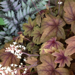 I was wondering the same about heucherella. My heuchera heave in the winter--even young plants and start off in the spring looking quite mangled. I try to reposition as best as possible.. Palace Purple does better than the caramel colored ones I have tried. I have some heuchera with fairly non descript leaves but long lasting red flowers that also grow better than the varieties with highly colored foliage. Tiarella, on the other hand, starts off looking great in early spring and goes on to provide a long spring display of the foamy white flowers which tend to look good with red tulips (tulips were eaten by deer this year though do I need to rethink that. I was wondering if the heucherella combined the clumping growth habit if Tiarella with the foliage coloration of heuchera.