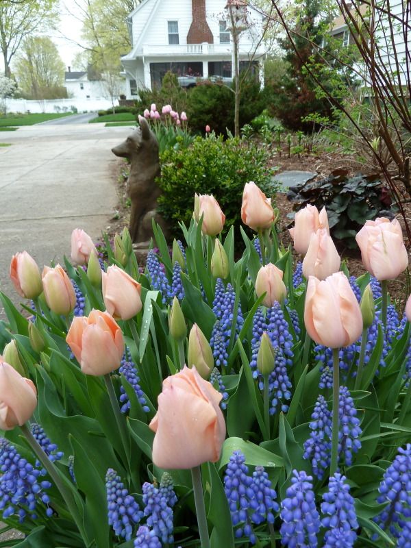 Tulip 'Apricot Impression' and muscari - just starting to really bloom.