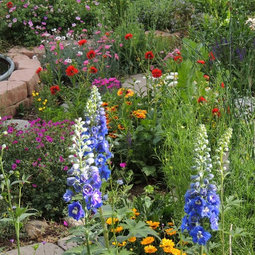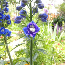 I have had mixed success with delphiniums. I have one in the small front bed I call the 'teardrop' bed (because of its shape) that was planted as a seedling in spring 2005 when that bed was created. That delphinium has come back every year since and flowers twice - once in late June- early July, and again in September. Others from the same batch of seedlings disappeared in about 5 years. The main difference that I can think of that might account for the success of this one when the others petered out is that this one is planted smack against the concrete paver brick edging, which is on top of a base of compacted limestone screenings, while the others were in the interior of beds, away from a source of lime. I've always heard that you should lime your delphiniums.... I'm not sure exactly what kind of delphinium it is. I grew both Magic Fountains and something called Crystal Springs (which I haven't seen around lately) and I'm not sure which this one is. Both those types are short ones - I didn't want to have to bother with staking!