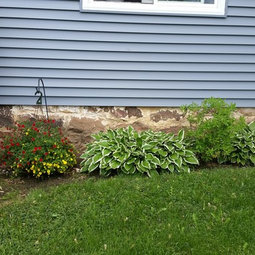 I don't have a problem with seeing the foundation; I just think visually there needs to be something taller, under the windows. I had also thought of a trellis of some kind, not necessarily an obelisk, against the house with something climbing. But I still think I would go with a taller evergreen, for winter interest.