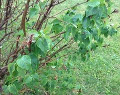 Thanks yet again for being so helpful, everyone! I just got home and went outside and tried to weed a bit around it. It looks like at one point there was a clear circular area, but it was overrun with (I think) wild violets? I apologize for my ignorance, I'm new to gardening. Also, I'll do a more thorough job later when I'm not getting soaked :) Anyway, it does seem (to me) to be securely anchored. Here are a few other pictures of what foliage it does have(in case it's not even a lilac at all!)
