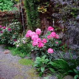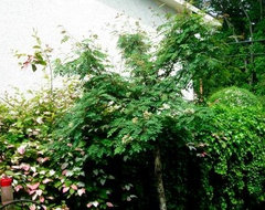 Camp, I do love it although I just about took it out after we had a high windstorm one day and snapped the top off, since then I've let several branches grow outward and keep the new sucker growth cut out, a sort of pseudo palm tree shape now to go in my pseudo courtyard, or maybe more like the tilt a whirl ride at the amusement park :). This is just outside our dining room window, in the fall when the leaves turn color and the pink berries, lushous. Again not a great pic but here's what the top looks like now, pic taken from our dining room window, each year the shape is getting to look a little bit better.