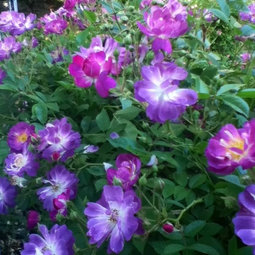 You're welcome, Andrea. Email Burling. I'm pretty sure she offers it or can find it for you. International Herald Tribune is another violet rose that flowers its ever-loving head off. It isn't as well scented as Sweet Chariot, but it's every bit as violet and a wonderful rose. Mr. Moore found early on that growing Sweet Chariot in smaller pots caused it to weep. He had a long, double row of heavily scented, hanging baskets of it lining the main walk at the nursery and he said that's when the rose told him its name. "Swing low, Sweet Chariot...". Planted in the open ground where the roots aren't restricted, it's much more upright and bushy. Kim