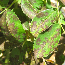 I DO notice and remove leaves on Hybrid Perpetuals which are beginning to rust. But new foliage is never touched.