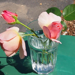 Tamora,which is almost identical to Evelyn as far as I can tell, blooms and blooms, facing west against a light-colored stucco wall, despite temps in the 90s.