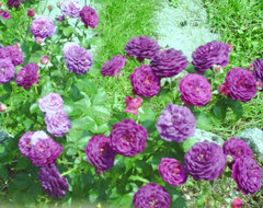 If you're worried about color clashes, you could always put a contrasting color between the roses. I have white/cream and burgundy as "filler" colors with my apricot roses, and I think apricot and lavender look nice together as well. Let us know if you need additional suggestions (who needs that grass, anyway - eh?)