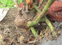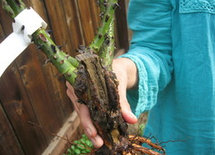 Then we heard a great panel discussion on Rose Rosette Disease, including Drs. Mark Windham, Byrnes, Ong, and Tzanetakis, all of whom have been studying RRD. The RRD virus has been identified, and research recently has fulfilled all three of KochâÂÂs postulates to prove that it is the causative agent. The disease has been observed in the US since the 1930s. ItâÂÂs transmitted from bush to bush by the âÂÂrose leaf curlâ eriophyid mite. It moves through the plant slowly at first, from cell to cell, but then rapidly moves through the plant to the roots and to other branches. So what else did we learn? The disease may exist in plants and plant parts that arenâÂÂt showing symptoms, so if we have any suspicion of RRD we should act quickly to remove the entire plant from our gardens. After removal of an infected plant (and ALL its roots), we can safely replant in that space in a couple of weeks, since the mite doesnâÂÂt seem to survive in the ground. Early studies have been inconclusive about controlling the mite with common miticides, though research continues. Different herbicides (Round-Up vs 2,4d) may produce different symptoms on roses, but unless those symptoms appear in several plants/places, damage is probably not due to herbicide drift. Meanwhile, we may also see different symptoms of RRD on different cultivars, and different symptoms when there are multiple viruses infecting a plant. We donâÂÂt need to worry about transmitting the virus from plant to plant with pruners (unlike rose mosaic). We learned that Lysol is inadequate as a disinfectant for our pruners �" the professionals recommend non-fat milk!